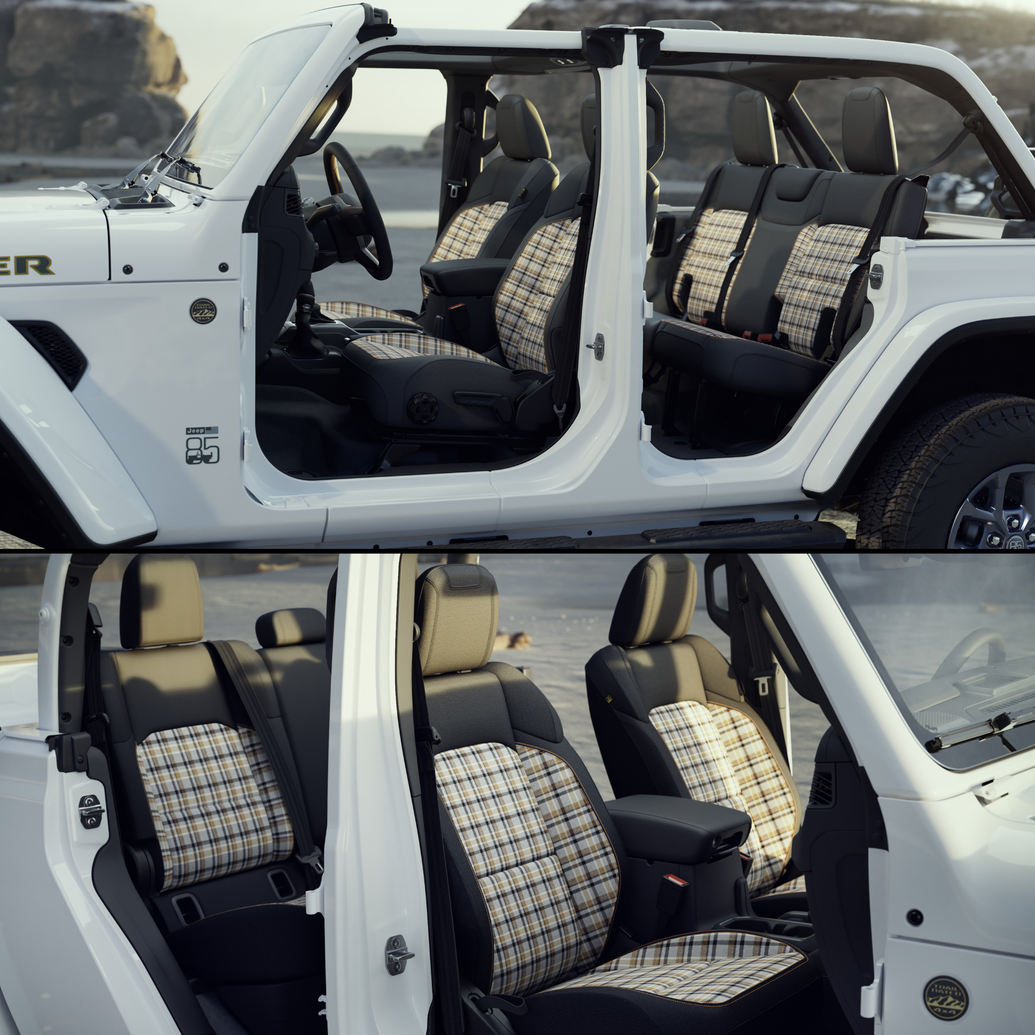 Cette édition spéciale se distingue par des crochets de remorquage couleur bronze, symbolisant force et durabilité, des jantes Steel Oxide associées à des décalcomanies Blue Agave pour un style extérieur unique, ainsi que des inserts de sièges en motif tartan ornés d’une étiquette commémorative du 85e anniversaire. L’édition inclut également un “duck” habillé de tartan avec un emblème spécial, clin d’œil à la tradition Jeep du “ducking”. L’ensemble compose un modèle à la fois collector, robuste et visuellement distinctif, conçu pour célébrer l’histoire de Jeep tout en affirmant son identité moderne
